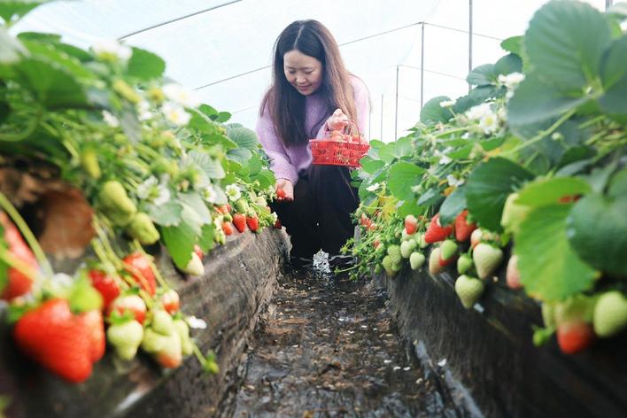 草莓缀蔓香满棚 采摘经济受青睐