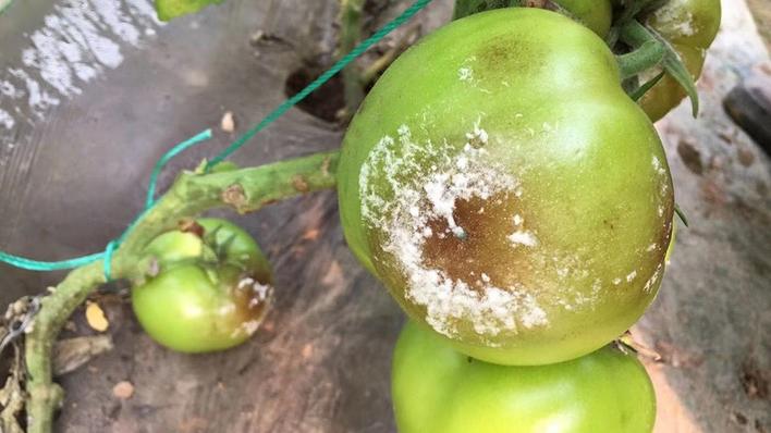 河南省焦作市一菜农微信咨询:番茄膨果结束临近转色时,部分果实表面出现了褐色病斑、有轮纹,病斑上还有白色的霉层,请问这是什么病害?