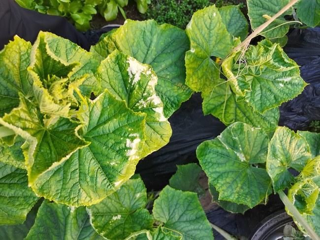 山东省济南市一菜农视频咨询:黄瓜部分叶片有鱼鳞片状白干斑点,有人说是细菌性叶斑病,请问这是什么病害,怎样防治?