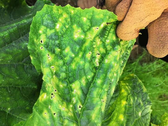 山东省潍坊市寿光一菜农微信咨询:黄瓜叶片上有很多病斑,有的病斑中间穿孔,有的中间是白色的,周边有黄晕,病斑往上发展迅速,请问这是什么病害?