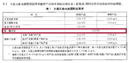 大量元素水溶肥料技术要求中规定:缩二脲含量不高于0.9%。不论固体产品还是液体产品均用百分含量(%)标明,而不是液体肥料用g/L标明。