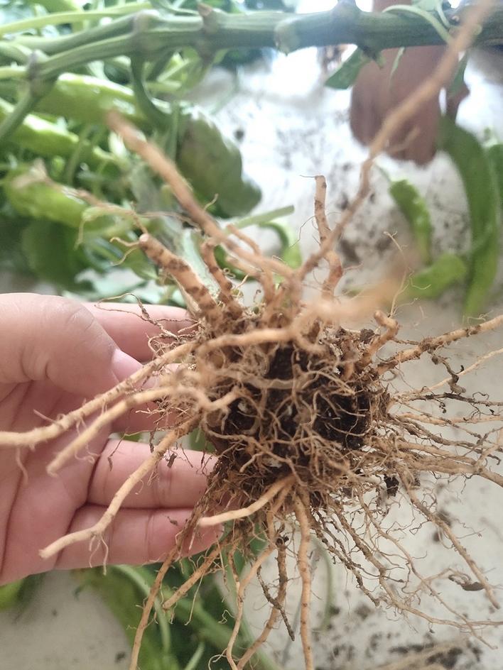 近日,山东省寿光市稻田镇有菜农反映,甜瓜刚开始膨瓜,为补充营养,她随水冲施了水溶肥和生根剂。但浇水后遇连阴天及降温天气,待天气转晴后,植株出现生长点叶片发黄、膨瓜慢的情况。经检查后,该菜农发现甜瓜的部分毛细根有发黄、变褐的情况。这是由于浇水、施肥后,遇低温寡照天气,土壤湿度过大,根系呼吸不畅,继而造成的伤根情况,若不能及时防治,这很容易发展成根腐病。
