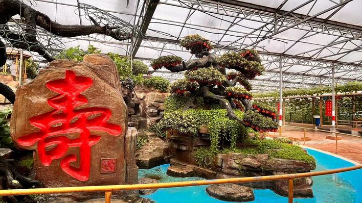 来到五号馆的中心景观,你会看到花草装点下,瀑布飞流而下,鱼儿悠游戏水。层峦叠嶂之中,大红色的“福”“禄”“寿”三字镌刻于山壁,融合雕塑、书法、园林造景艺术为一体,喜庆吉祥,民俗气息浓郁。