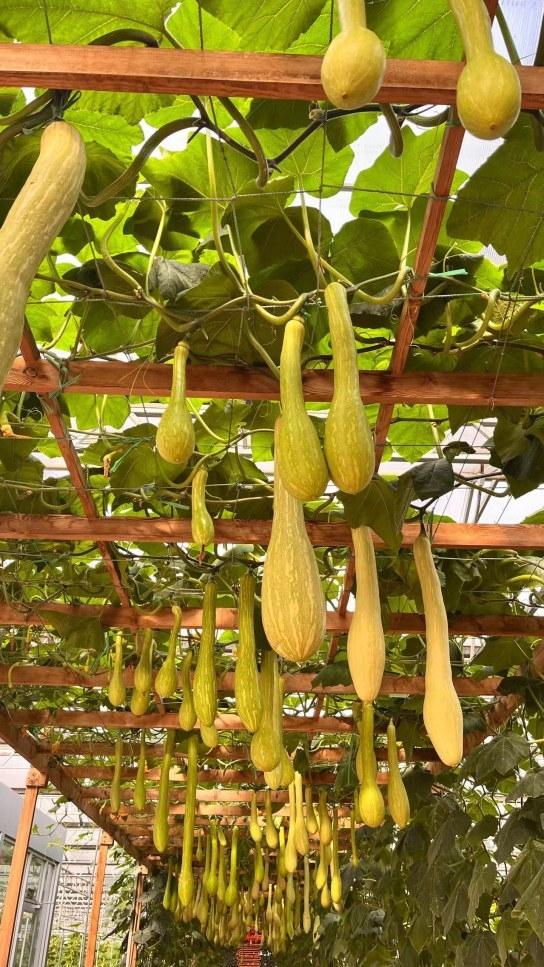 空廊架之下,垂吊着形态各异的葫芦、南瓜、吊瓜等各类瓜果,勾勒出一幅幅美好的田园画卷。
