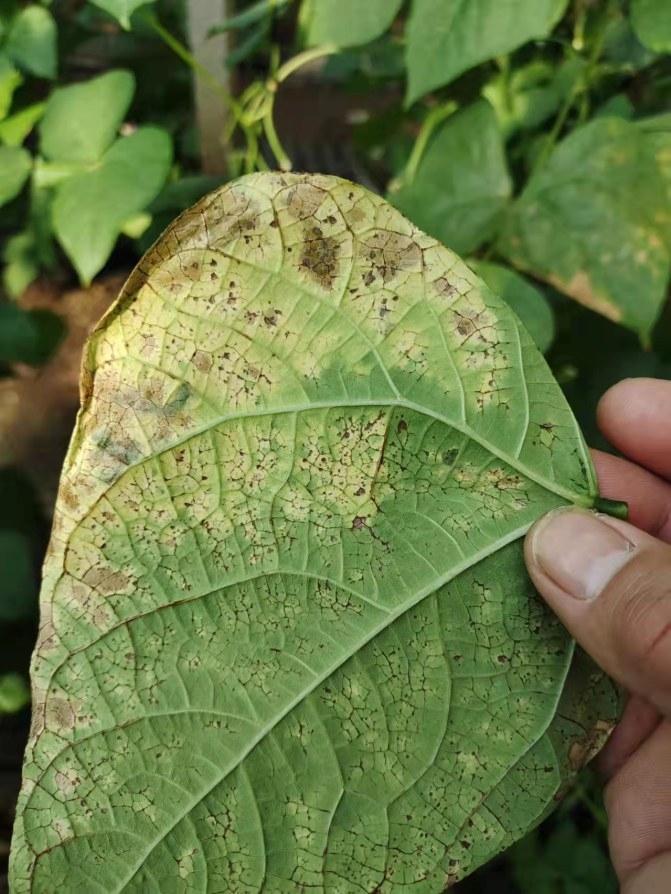 症状描述:芸豆叶片出现不规则水渍状斑点,斑点周围有晕圈,染病叶脉变黑坏死。
