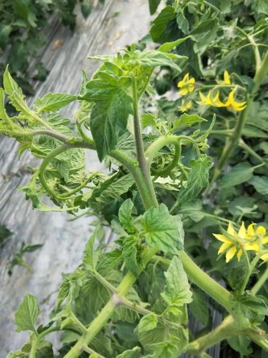 症状描述:番茄植株生长点附近的侧枝向下弯曲生长,呈“抱头状”。