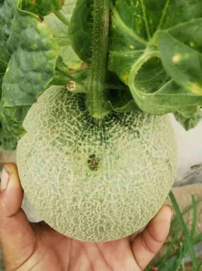 症状描述:厚皮甜瓜果实上出现暗绿色腐烂斑,往里扩展1厘米左右。