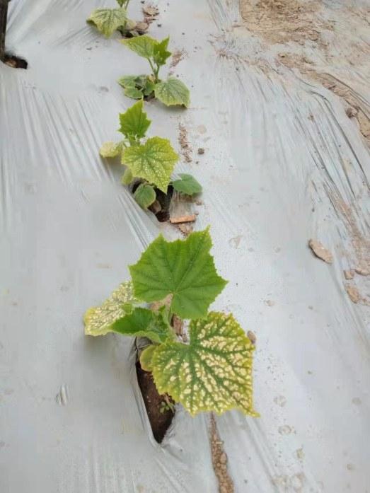 症状描述:拱棚黄瓜很多植株的叶片出现褪绿斑点,导致叶片黄化,贴近地膜的叶片受害严重。