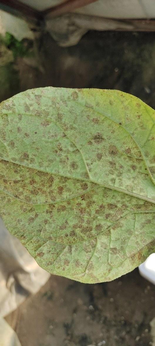 症状描述:茄子叶片正面现褪绿黄斑,叶背面出现灰褐色或黑褐色的霉层。