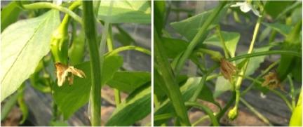 近日,山东省青州市高柳镇辣椒种植户李师傅打来电话,说他棚内的辣椒刚刚进入采摘期,但是不知道什么原因,辣椒花一直“挂”在果实上,有的花朵将果实顶部覆盖,看不到脐部,有的花朵已经将幼果全部包围。由于残花不脱落,眼下冬之将至,低温寡照天气增多,若遇到连续阴天或雪天,棚内湿度大,万一灰霉孢子从残花侵入,很容易导致灰霉病流行,不利于辣椒高产优质。那么,辣椒残花为何“挂”在果上而迟迟不脱落呢?