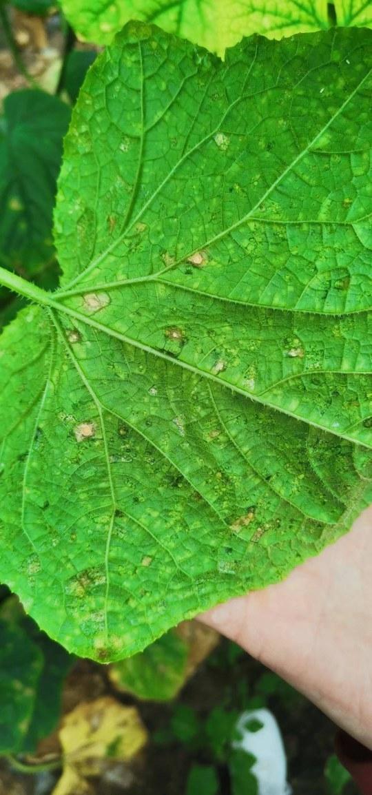 症状描述:黄瓜叶片上了小黄点,病斑中间部位有明显“靶心”。