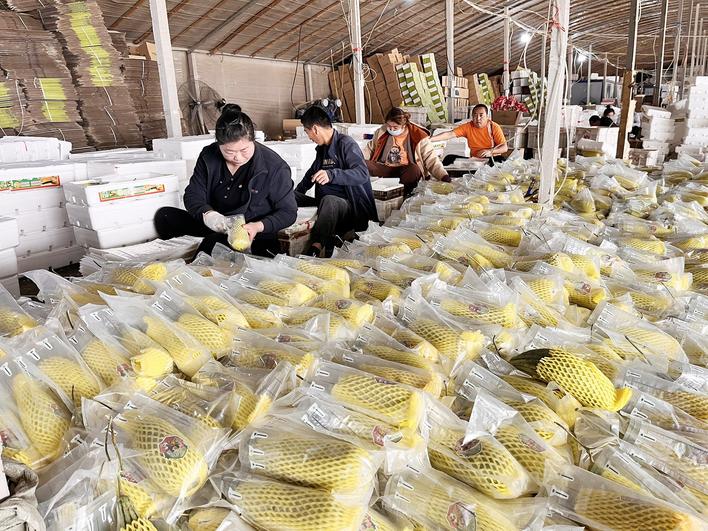 3月21日,在山东省寿光市稻田镇的吉地良田果蔬合作社内,工人们正在分拣、包装新到货的羊角蜜。合作社负责人刘存吉介绍,本周羊角蜜大量上市,订单量持续增加,日销量5万多斤。“今天这批羊角蜜是山西的一家电商公司销售的。网店接到订单后,由合作社负责从各地收购羊角蜜,然后集中分拣、包装,最后直接从合作社发货,直达消费者手中。”他说。据了解,近期,包括山东、云南等地的羊角蜜开启了集中上市期,价格也一直比较高。寿光稻田有许多经营甜瓜的合作社,有的是为电商选货、发货,有的是集中在线下市场交易,线上线下交易火爆。 本报记者 王凯旋
