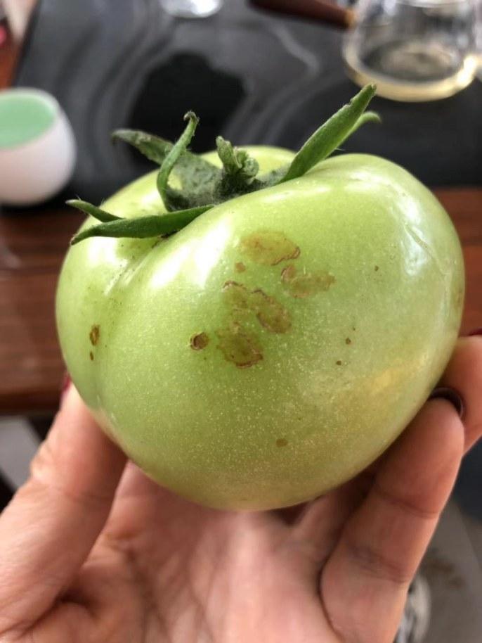 河北省邯郸市有菜农微信咨询:膨果后期的番茄果实表皮上有凹凸不平的褐色病斑,请问这是什么病害?