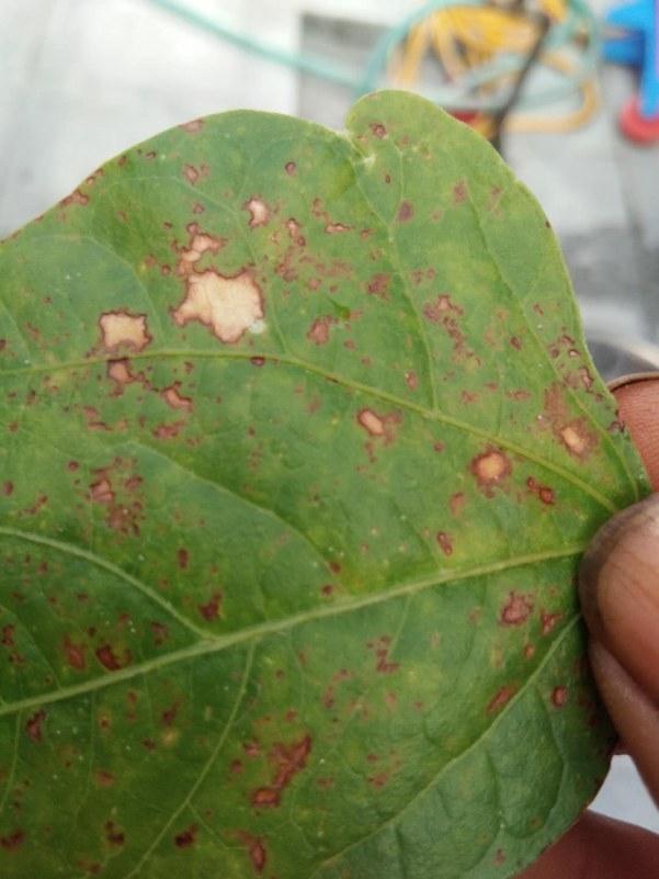 症状描述:豆角叶片发红,上面长有大小不等的红斑,造成叶片局部坏死。