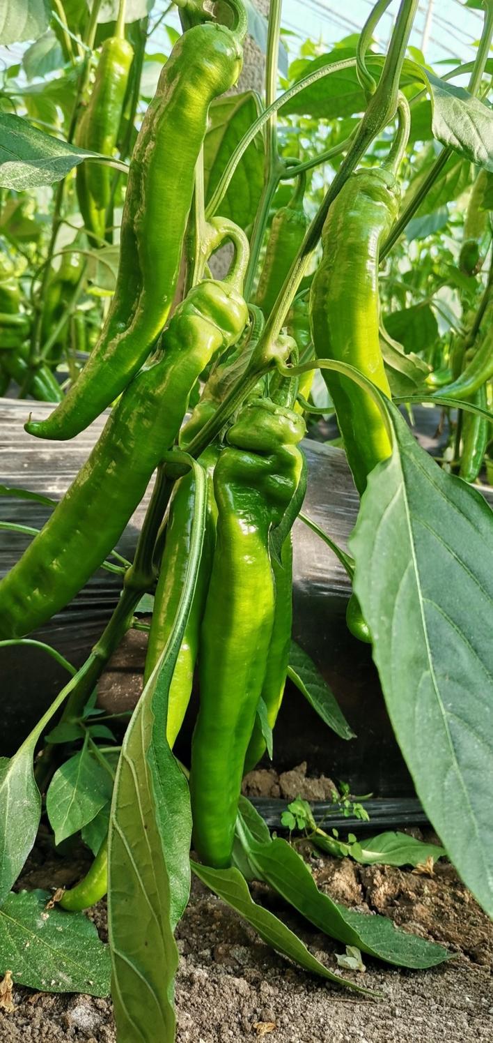 冬季低温季节,尖椒上的畸形果比较多,比较突出的是果实变弯、短小,严重影响商品性。硼肥缺乏、开花坐果时温度没有控制好、植株长势没有调控好等因素会导致果实变短;而果实受外力阻挡、开花结果期温度不适宜、营养不足等因素会导致果实变弯。
