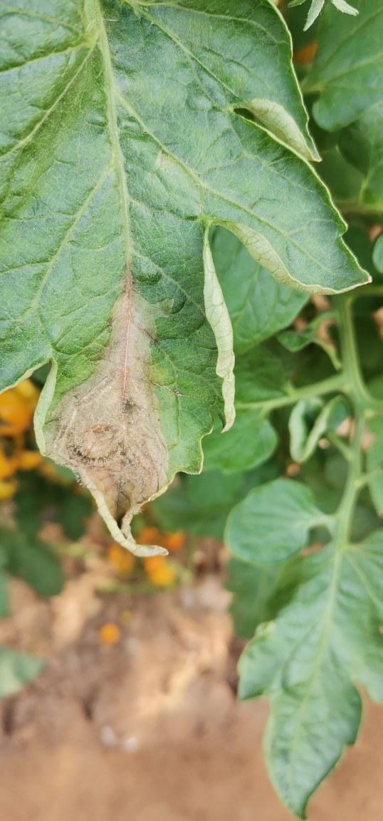 症状描述:番茄叶片从叶尖处开始出现褐色的大斑,着生灰色霉层。