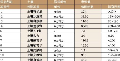 检测结果表明,土壤有机质含量适宜,土壤水解氮含量超标,土壤有效磷含量适宜,土壤速效钾含量超标(较适宜范围下限超标2倍多),土壤盐分含量超标,土壤氯离子含量适宜,土壤钠离子含量超标,土壤交换钙含量不足,土壤交换镁含量不足,土壤有效硫含量适宜,土壤呈弱碱性。