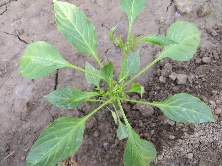 症状描述:辣椒苗定植快10天了,迟迟不肯长,新叶卷曲皱缩,叶脉畸形。