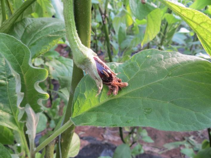 症状描述:茄子果实上的残花水烂,慢慢向果面扩展,导致果实腐烂。