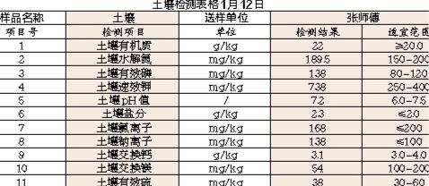 镁含量54.0mg/kg(适宜范围100-200mg/kg),土壤有效硫含量38.0mg/kg(适宜范围30-60mg/kg),土壤pH值7.2。