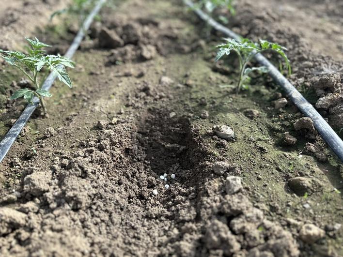 如果蔬菜定植前因种种原因没有施用硼肥,也可以在幼苗缓苗后,在种植行间施用固体硼肥,同样也可达到不错的补硼效果。山东省潍坊市寿光洛城街道的张普国就采用的这种补硼方式,据张普国介绍,他的拱棚番茄缓苗后,他在种植行间每四株挖一个穴,每穴施用5-6片缓释型硼片,之后覆土。通过肥料缓慢释放硼养分,可减少硼肥流失,这样番茄根系吸收硼元素后可再传输运转至其他生长部位,从而达到补硼的目的。
