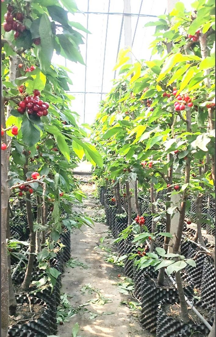 近段时间来,山东省潍坊市寿光古城街道的周兴刚特别忙碌,因为现在正是大棚盆栽单杆樱桃的集中上市期,棵棵樱桃树自下而上挂满了樱桃,十分喜人。这种栽培模式很少见,每亩地可种植1700棵樱桃,高度控制在160厘米左右,选择侧枝结果,每根侧枝长20厘米—30厘米。在这样密植的情况下一棵樱桃树每年的结果量在1.5千克—2.5千克,亩产能达到2000千克—2500千克。