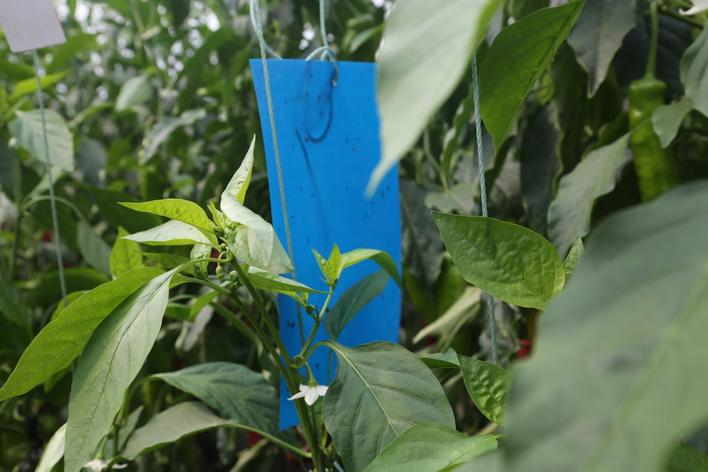 棚内悬挂粘虫板可以提早发现蓟马发生状况,并起到一定的杀虫作用,是棚内蓟马防治的第一步。但是有的菜农悬挂粘虫板时不注意细节,而是看别人用了,就“照葫芦画瓢”也用上,例如,不了解蓟马习性悬挂了黄色粘虫板,或者粘虫板悬挂位置不当,降低了防虫效果。