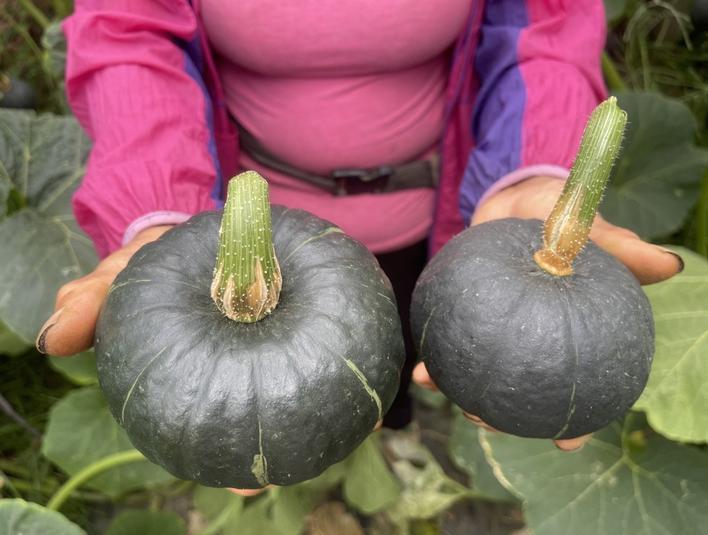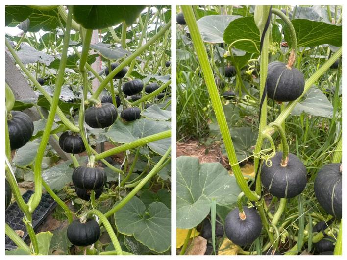 一进棚记者看到,王师傅邻居棚内的南瓜叶片长势虽然没有王师傅的南瓜旺盛,但果实数量及果实大小明显优于王师傅的南瓜,且果实形状规整,南瓜瓜柄处凹陷,叶柄长度仅有成年人小臂长,果实表面纹理清晰、有规则,各种表现符合正常“大麻籽”南瓜的品种特性。