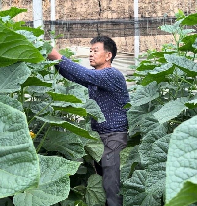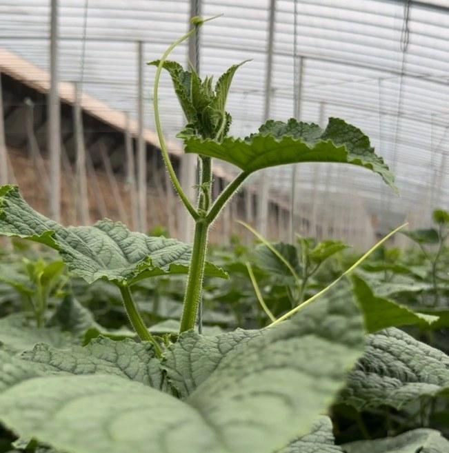 目前,黄瓜已经采摘一个月,棚内黄瓜依然长势健壮,茎秆粗壮,叶片墨绿,瓜条顺直,生长点劲头十足。