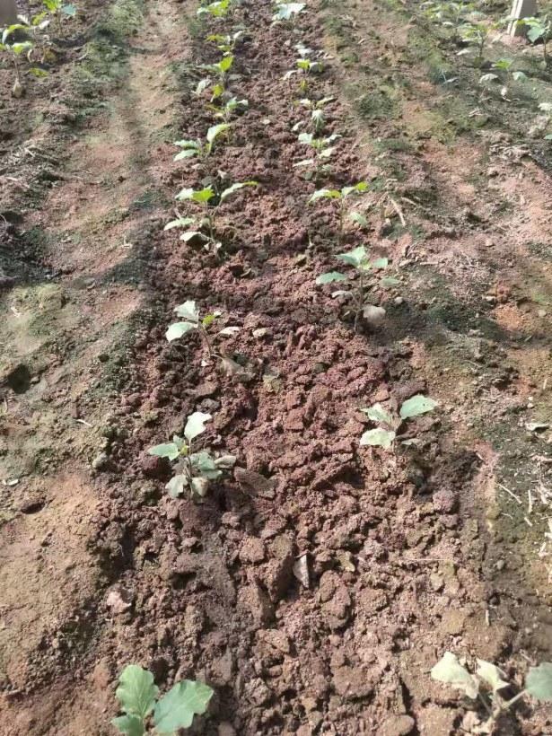 刚定植不久的小苗,由于根系浅、弱,划锄时先用二齿钩浅划一遍,第二天再用锄头将划出的土块推细划锄松。需要注意的是,因苗子较小,操作要小心,划锄不要靠植株太近,深度也要浅,防止将根系划断,影响苗子正常生长。