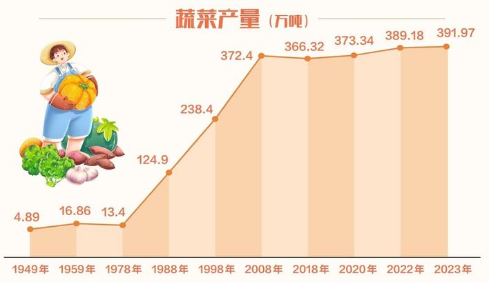 1949年蔬菜产量4.89万吨,到2023年蔬菜产量达到391.97万吨,增长了79倍多。农村居民人均可支配收入由1978年的74元,增长到2023年的30303元。