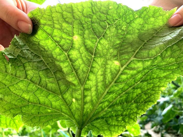 霜霉病危害叶片后,叶背面为黄褐色水浸状,尤其在早晨空气湿度大时会更加明显,发病中后期叶背出现灰黑色霉状物。由于受叶脉限制,病斑呈多角形、蔓延快,发病后期病斑会连成一片。靶斑病的病斑近圆形或者椭圆形,比霜霉病的病斑小,迎光观察,可见中间部位有明显“靶心”。高温、高湿条件下易产生大病斑,干燥时多产生小病斑。病毒病既可危害叶片也可危害瓜条,受害叶片花叶、皱缩,受害瓜条凹凸不平、黄化失绿。