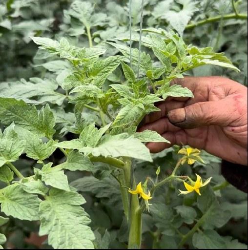 其中,让他印象最深的是,有一株病毒病植株,从中部叶片就开始发黄变小,从一行看,十分显眼,冲施两次壳寡糖锌后,有了明显缓解,叶片变大、变绿,生长点的症状也减轻了,后来又多留了两穗果实。