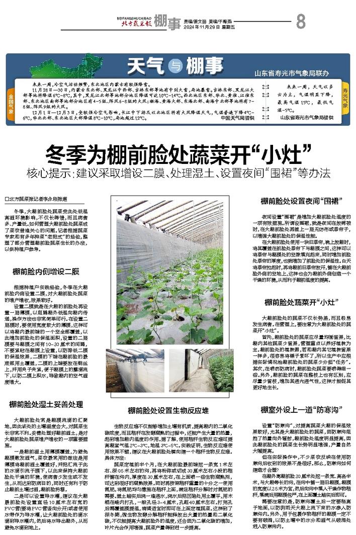 冬季,大棚前脸处蔬菜受此处低温高湿环境影响,不仅长得慢,而且病害多、产量低。如何管理大棚前脸处蔬菜成了菜农普遍关心的问题。记者根据蔬菜专家和有多年种菜“老把式”的经验,整理了部分管理棚前脸蔬菜生长的办法,以供种植户参考。