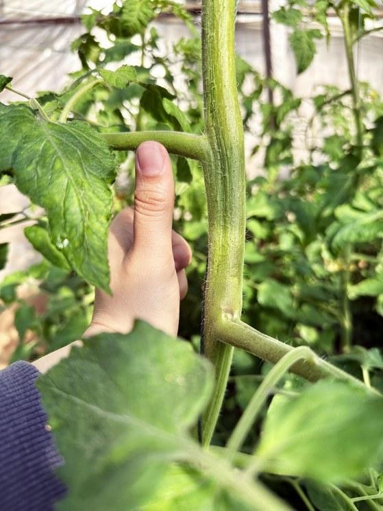 相对于新一代高温大棚而言,当地大棚结构简单、保温性差。初果期的草莓番茄长至1.2米高,下部两三穗果已经完成授粉。植株长势有个明显的共同点:茎秆尤为粗壮、叶片大而薄,目前,生长点以下茎秆明显变细,但这种长势是不正常的。