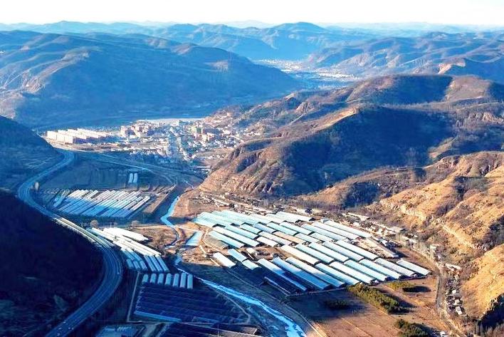 1月7日,无人机航拍下位于延安市安塞区招安镇枣湾村的设施蔬菜生产基地照片。