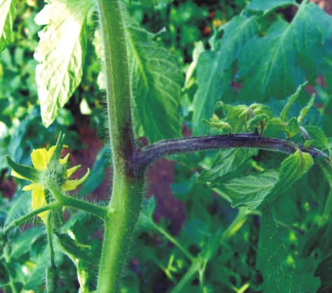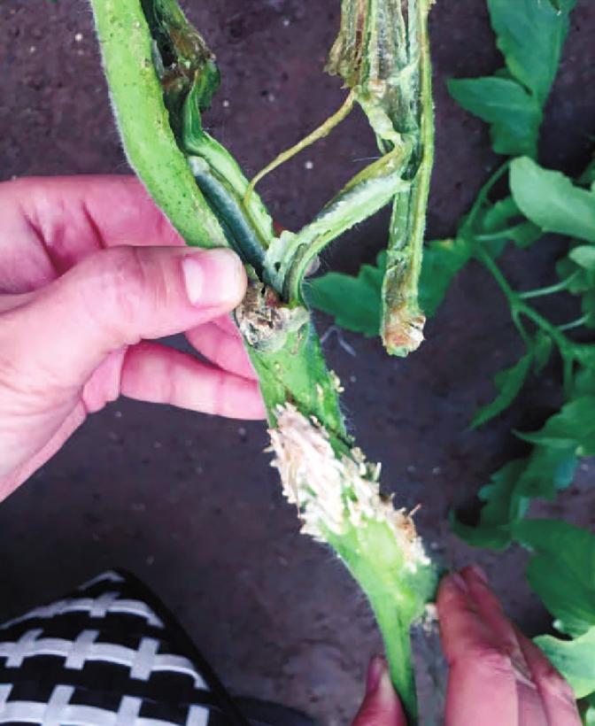 细菌性髓部坏死是西红柿生长期间的高发病害。该病主要从整枝疏叶留下的伤口处侵入,发病初期嫩叶褪绿,茎部长出很多不定根,而后病茎表面变褐色至黑褐色斑,之后茎秆逐渐绵软,剖开后会发现茎秆内部的细胞松散,按压有菌脓流出,最终茎秆中空,全株萎蔫而亡。