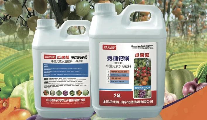 氨糖钙镁是氨糖螯合钙、镁、硼、铁、锌等中微量元素形成的功能型肥料。其中,氨糖易溶于水,吸收利用率高,施用后能提高作物的抗逆能力。钙含量很高,130克/升,远超于其它钙肥产品。施用后,具有防裂增甜、快速膨果、增加果实表光度等三大作用。