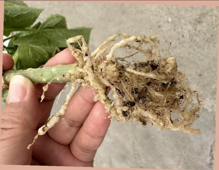 山东省淄博市一菜农电话咨询:我棚内的黄瓜正处结瓜期,但是很多植株叶片发黄,长势也偏弱,拔出植株后,发现上了根结线虫,整个根系布满大小不等的瘤状物。请问在黄瓜结瓜期如何有效防治线虫?