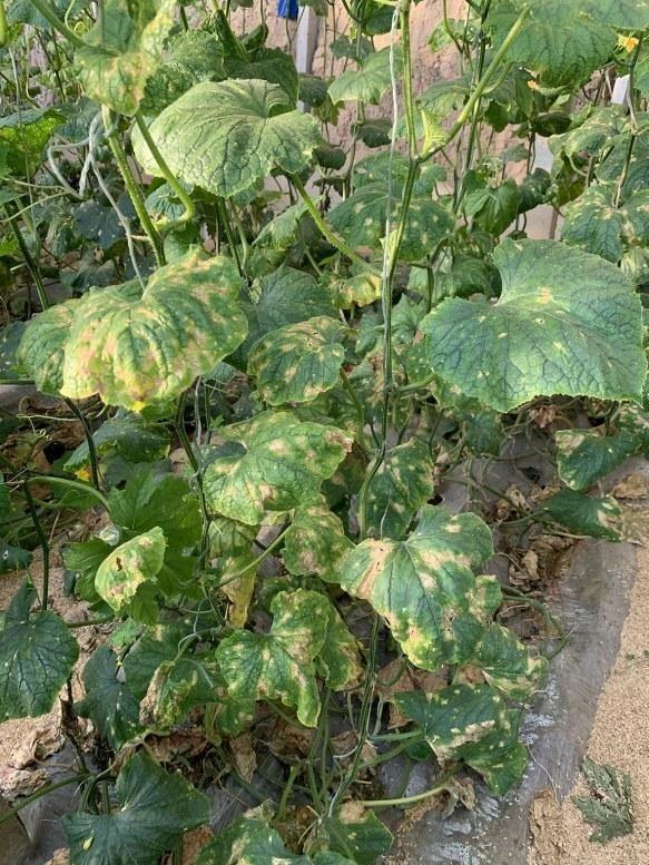 山东省潍坊市寿光孙家集街道一带的越冬茬黄瓜大多是10月份定植的,近期不少菜农反映黄瓜长势不良:瓜打顶严重、棵子细、叶片黄化,并伴有靶斑病、炭疽病等多种病害混发,棵子拉不动黄瓜生长。