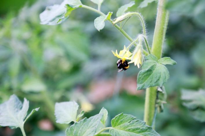 熊蜂授粉。在番茄开花前1天—2天,将蜂群放入温室,每1000平方米放置1箱蜂(60只/箱—80只/箱),既能授粉又有助于降低灰霉病发生风险。