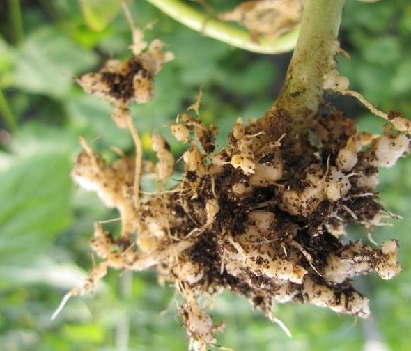 由于根结线虫虫体小,主要在地下侵害作物根系,不易被发现,等到发现根瘤或出现萎蔫、黄叶等症状时,植株根系往往大部分已被侵染或者已经病入“膏肓”,再用药防治很难达到理想效果。因此,根结线虫一定要提前预防,或者在发病初期早用药,重点应从根系入手,根系是吸收水分和养分的主要器官,根系受线虫侵染后,吸收能力变弱,叶片颜色往往变淡或发黄,并且在蒸腾作用强烈的中午前后,也容易会出现轻微的萎蔫症状。若发现棚内有植株出现上述症状,要提早检查确诊,最好在发病初期用药,以达到良好用药效果,避免线虫的暴发和流行。
