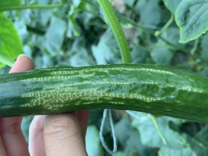 激素使用不当。蘸花药出现问题,往往导致整棚发生皴皮现象。蘸花药浓度过大或者冲施大量激素肥料,在短时间内促进瓜条快速生长,会影响瓜条表皮的抗逆性,更容易出现裂纹。建议随温度及时调整蘸花药浓度,减少农药添加,减轻蘸花药对黄瓜表皮的刺激,减少皴皮发生。一旦因蘸花药浓度过大出现皴皮,可通过叶面喷施爱多收6000倍、甲壳素1000倍等缓解。