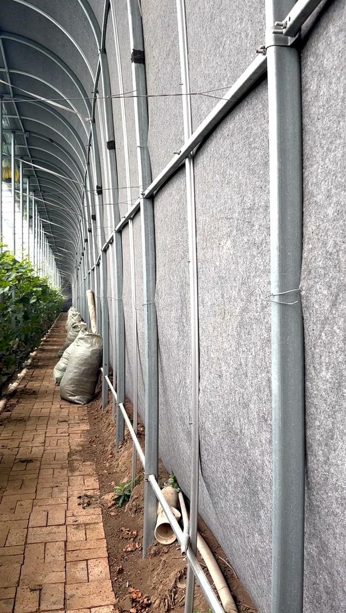 据了解,大棚采用全钢架结构,后墙部分用两层无纺布夹农膜替代,省去了传统大棚挖土筑墙的工序,不仅每亩造价降低,还避免了土地资源浪费,土地利用率直接提升至90%以上,能更高效地规划作物布局。不过,其保温性略逊于传统后墙大棚。据种植户介绍,深冬最冷的几天,需要在棚里加挂保温被、设小拱棚,根据种植作物调整保温措施。