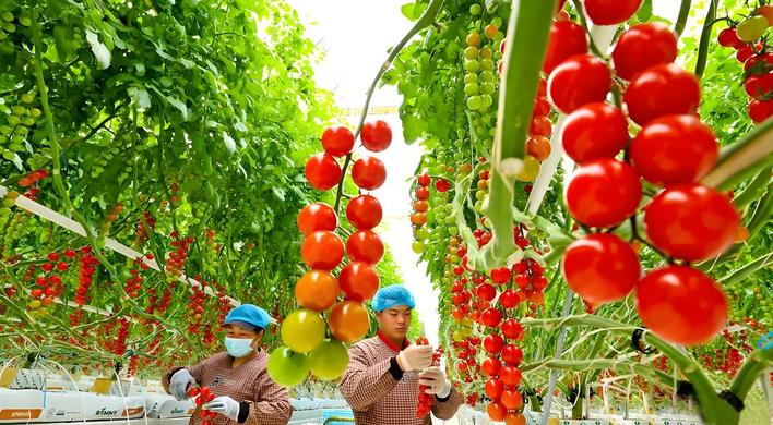 甘肃省张掖市甘州区位于河西走廊中部。眼下,甘州区三闸镇一处智慧农业产业园迎来樱桃番茄的采摘“黄金期”,智能温室里一串串红彤彤的樱桃番茄挂满枝头,工人正忙着采摘、分拣、包装、搬运,销往北京、天津、上海、广州等地。