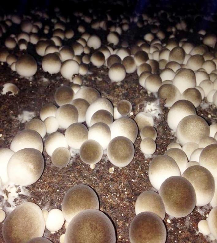 一般情况下,播种7天后培养料表面长满网状的气生菌丝,并开始有菇蕾形成,此时应注意保温、保湿,并适当通风换气。及时增加料面湿度,打好“出菇水”,增加室内光照,促使草菇子实体形成。当大量小白点的菌蕾形成时,以保湿为主,相对湿度维持在90%以上,床面暂停喷水。当子实体有钮扣大小时,应逐渐增加喷水用量。